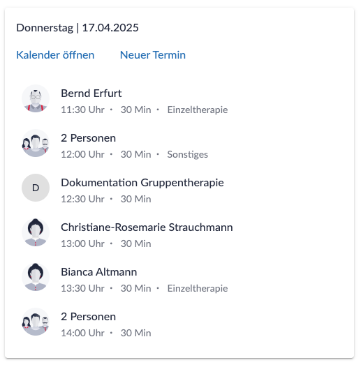 Auf der Startseite werden Ihnen die nächsten neun anstehenden Termine in Form einer Terminkarte als Liste angezeigt. Diese Karte bezieht sich stets auf die tagesaktuellen Termine.