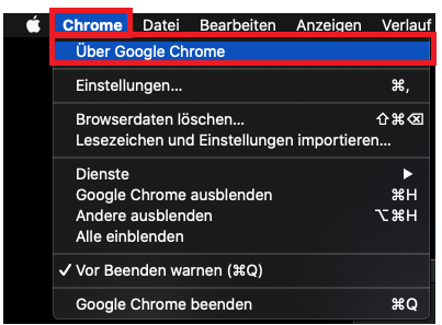 Klicken Sie bitte rechts neben dem Apple-Symbol auf den Menüpunkt "Chrom" und wählen "Über Google Chrome" aus.