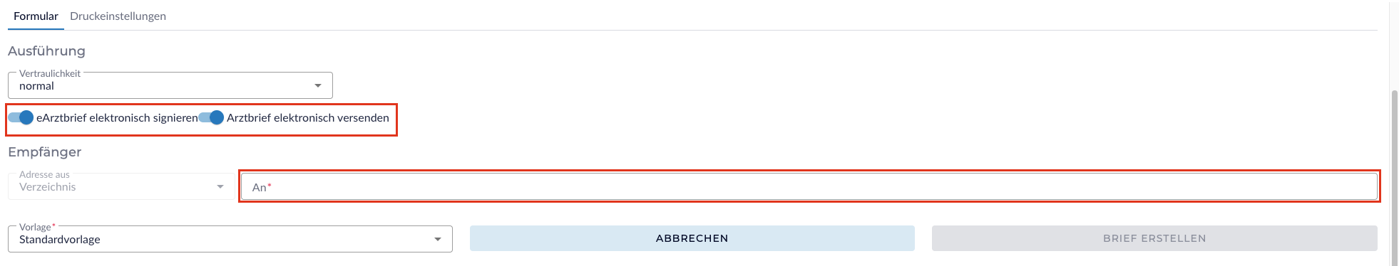 Mit <Abschliessen> startet, falls dies aktiviert wurde, die Signierung / der Versand des eArztbriefes. Wurde die Checkbox <Drucken> zuvor aktiviert, startet ebenfalls der Druck am hinterlegten Drucker.