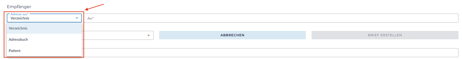 Der Empfänger des eArztbriefes wird in der Empfängerzeile “An” eingetragen. Eine Vorlage muss in dem Menü ausgewählt werden, da ein eArztbrief bestimmte Informationen enthalten muss.