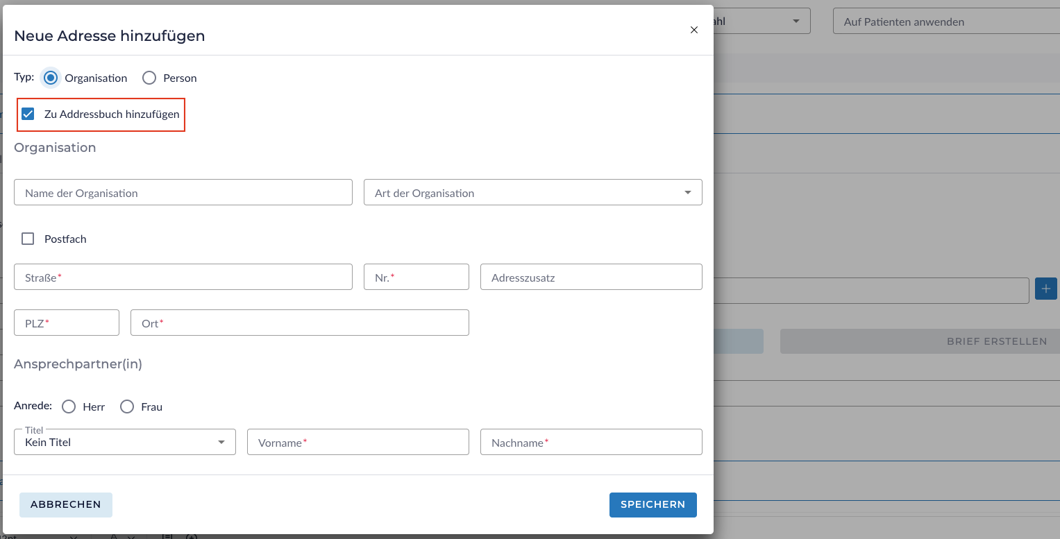 Es öffnet sich das Adressbuchmodal. Geben Sie hier die gewünschte Adresse an. Mit Checkbox "Zu Adressbuch hinzufügen" entscheiden Sie, ob die Adresse einmalig übernommen wird für diesen Brief oder ebenso im Adressbuch gespeichert wird.