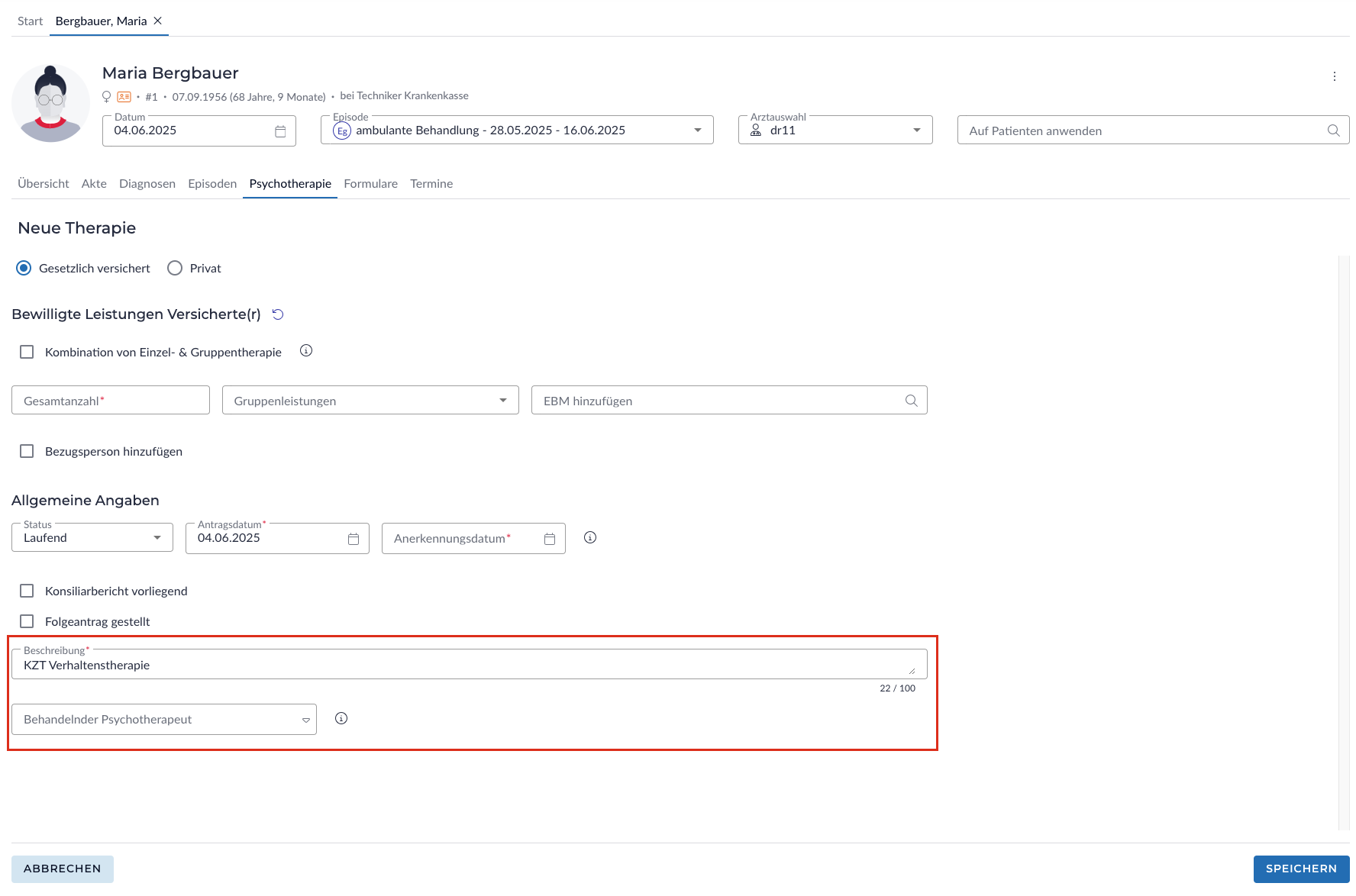 Das Dropdown Behandelnder Psychotherapeut zeigt Ihnen alle im System hinterlegten Benutzer Ihrer Praxis an.