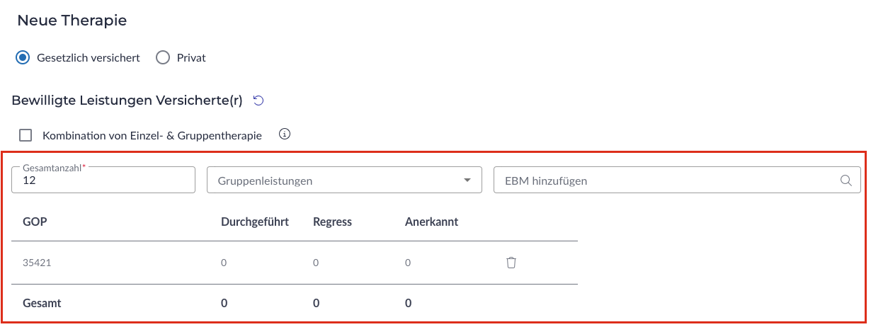 Unter Gruppentherapeutische Leistungen oder EBM suchen und hinzufügen tragen Sie bitte die bewilligten Leistungsziffern ein.