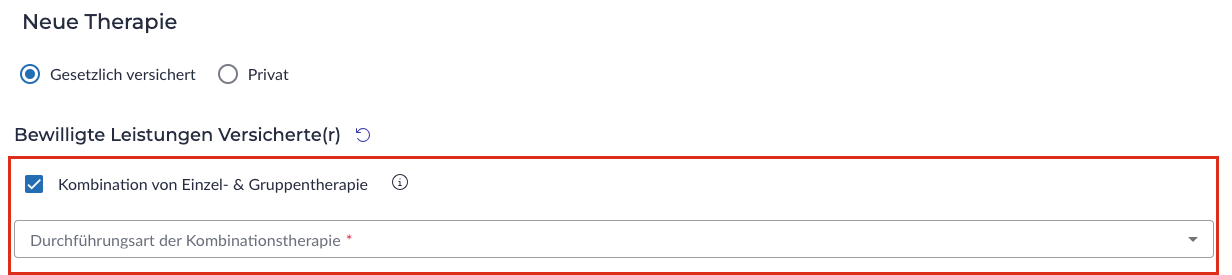 Aktivieren Sie die Checkbox um zwischen der Kombination von Einzel- und Gruppentherapie, wenn eine Sie eine Kombination aus beiden planen. Unterhalb daneben, können Sie die Durchführungsart der Kombinationstherapie auswählen.