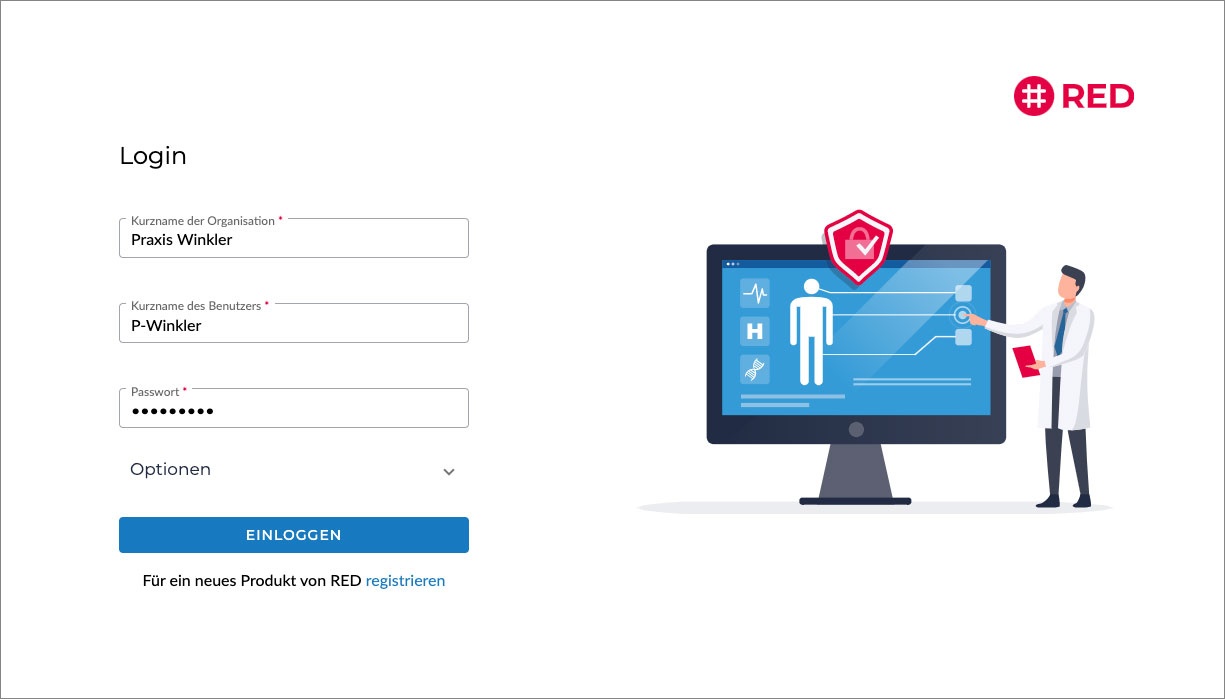 Optionen - RED kann den Kurznamen und den Benutzernamen auf diesem Gerät speichern. Damit erspart RED Ihnen die Eingabe bei der nächsten Anmeldung. Die Speicherung erfolgt im lokalen Speicher des Webbrowsers. Verwenden Sie Sicherheitseinstellungen des Browsers, mit denen der Speicher z.B. beim Schließen des Webbrowsers geleert wird, kann die Vorbelegung von Kurz- und Benutzernamen nicht genutzt werden.
