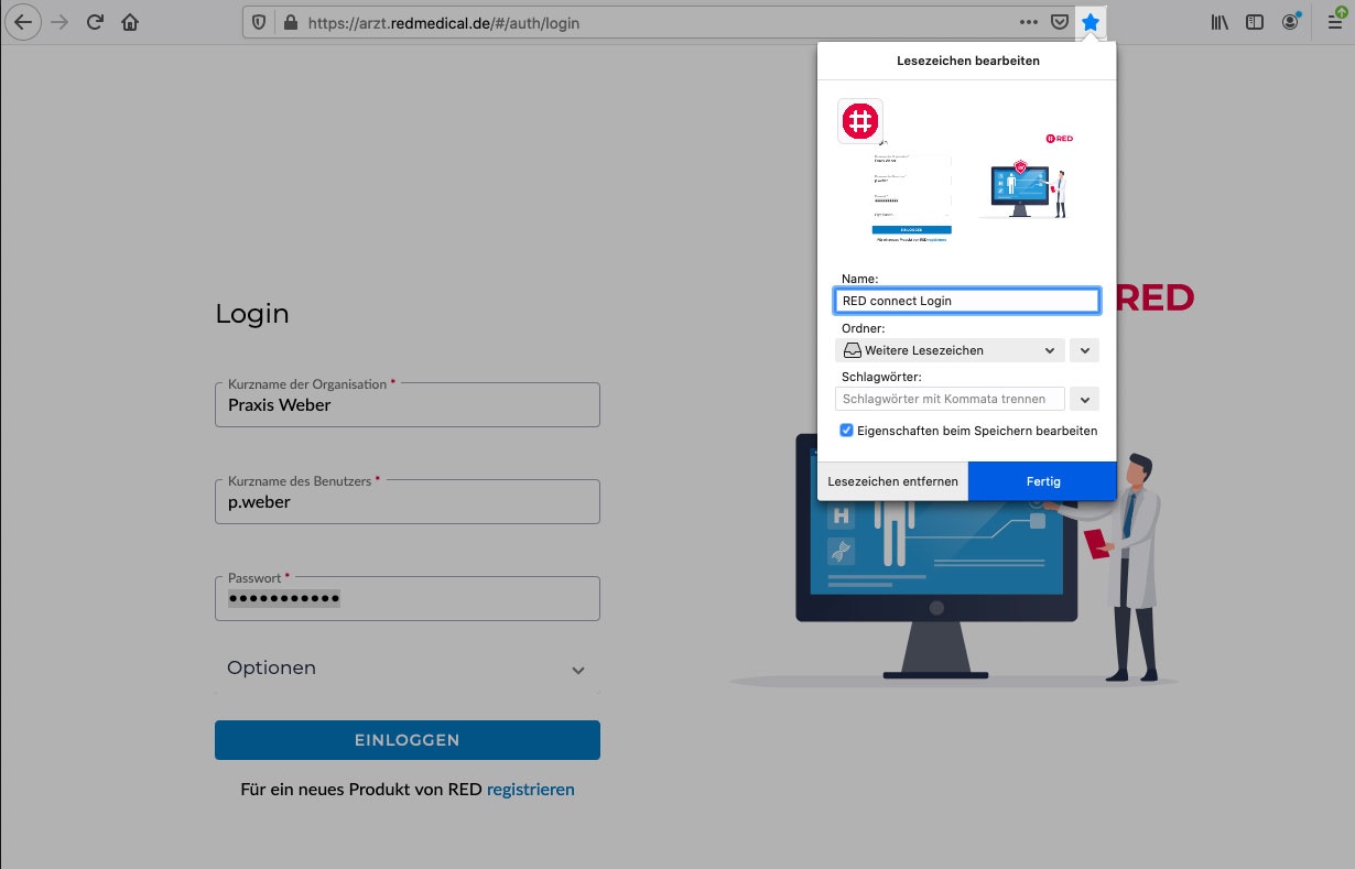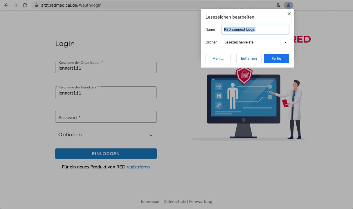 Lesezeichen werden in Webbrowsern verwendet, um Webseiten oder Applikationen wie RED medical oder die RED connect Videosprechstunde schnell wieder aufzurufen. Um ein Lesezeichen zu setzen, rufen Sie in der Adresszeile Ihres Browsers die gewünschte Webseite auf (z.B. https://arzt.redmedical.de)