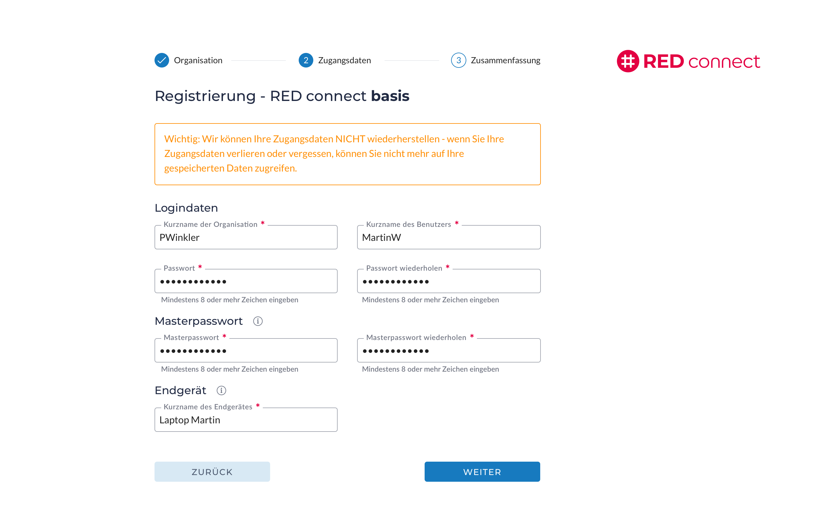Bitte notieren Sie sich Ihre Zugangsdaten und heben diese an einem sicheren Ort auf. RED Medical selbst kann bei Verlust Ihren Zugang NICHT wieder herstellen.