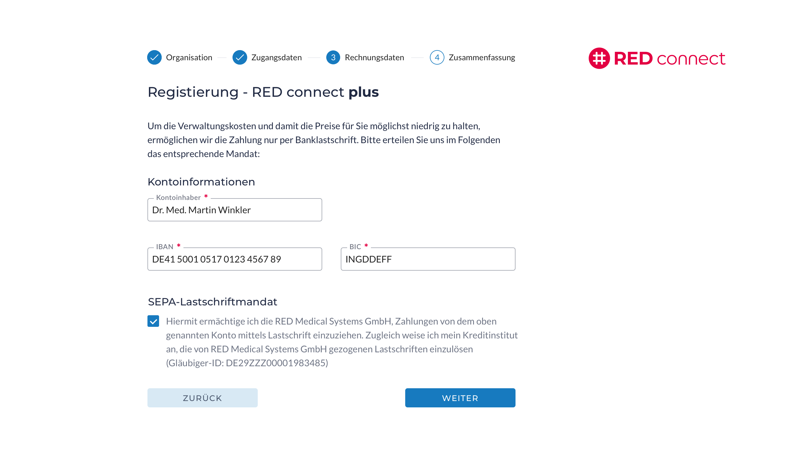 Kontoinformationen - diese werden nur für die monatliche Abbuchung bei der RED connect plus Version benötigt. Bei der Registrierung von RED connect basis gibt es diesen Registrierungs-Schritt nicht.