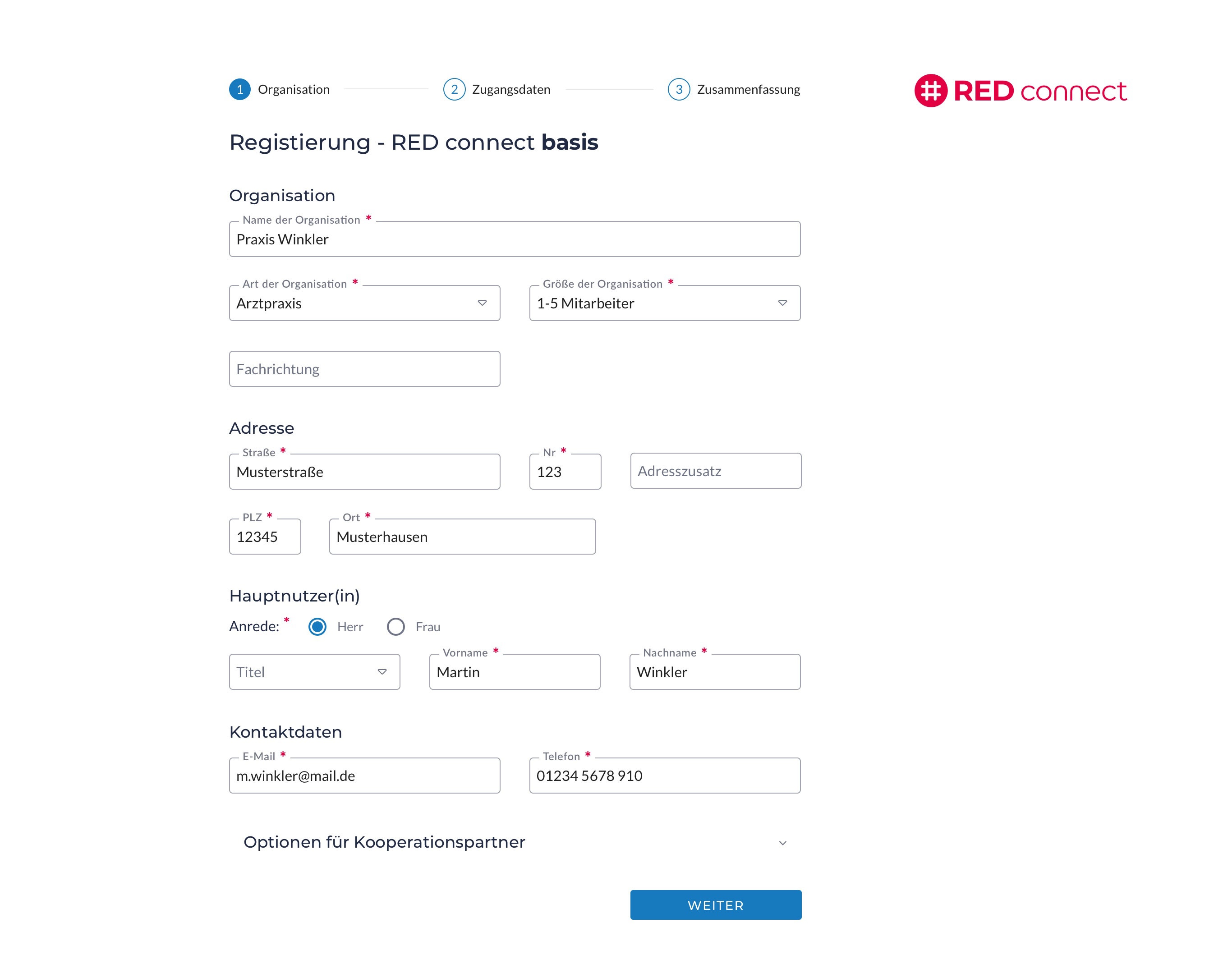 Um die RED connect Videosprechstunde als Organisation nutzen zu können, müssen Sie sich am Anfang einmalig registrieren. Nachdem Sie alle Informationen erfasst haben, richten wir Ihr persönliches System ein, mit dem Sie dann sofort loslegen können. Teilnehmer/innen müssen sich in RED connect nicht registrieren.