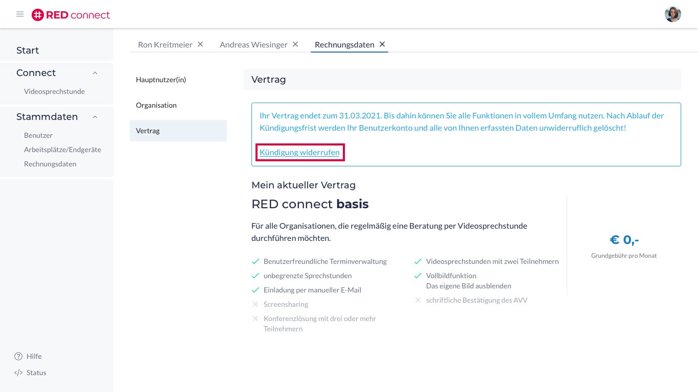 Hierfür gehen Sie über das Menü “Stammdaten” in den Bereich “Rechnungsdaten” und wählen in der Übersicht “Vertrag” aus.