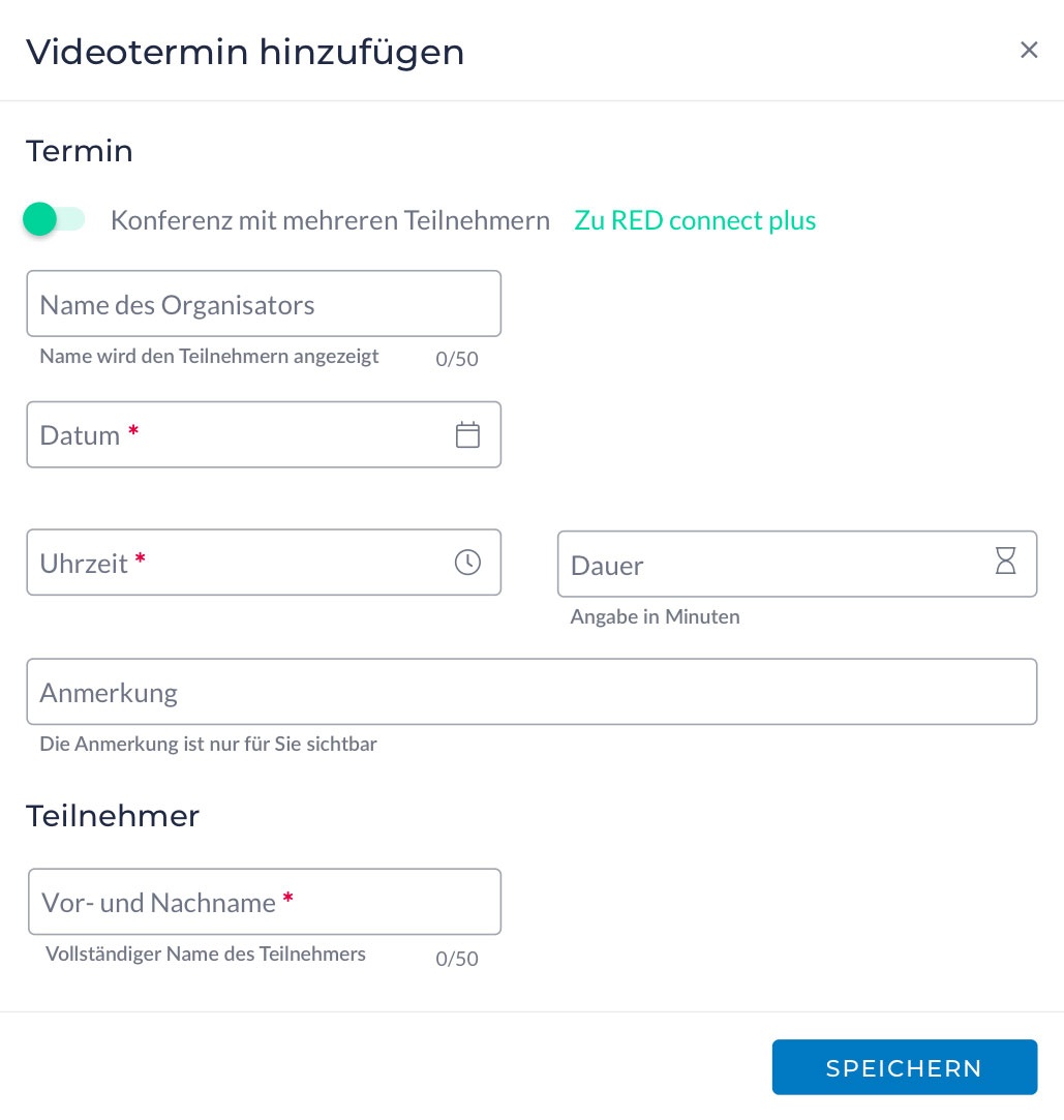Bei RED connect plus haben Sie die Möglichkeit einen Termin mit mehreren Teilnehmern anzulegen. Dazu können Sie oben den Schalter “Konferenz mit mehreren Teilnehmern” aktiveren. Neben den bekannten Angaben können Sie jetzt zusätzlich folgende Inhalte erfassen:
