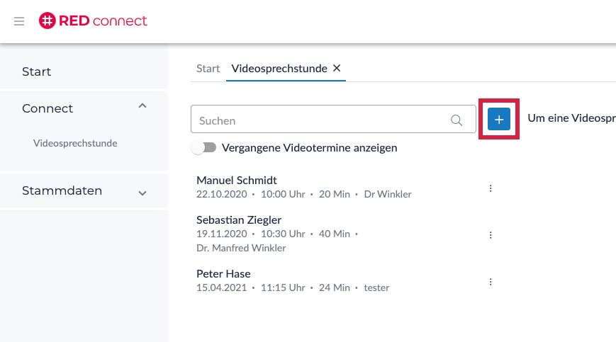 Melden Sie sich in RED connect an und klicken Sie auf den Tab Videosprechstunde. Durch Klick auf das + rufen Sie die Maske Videosprechstunde hinzufügen auf.