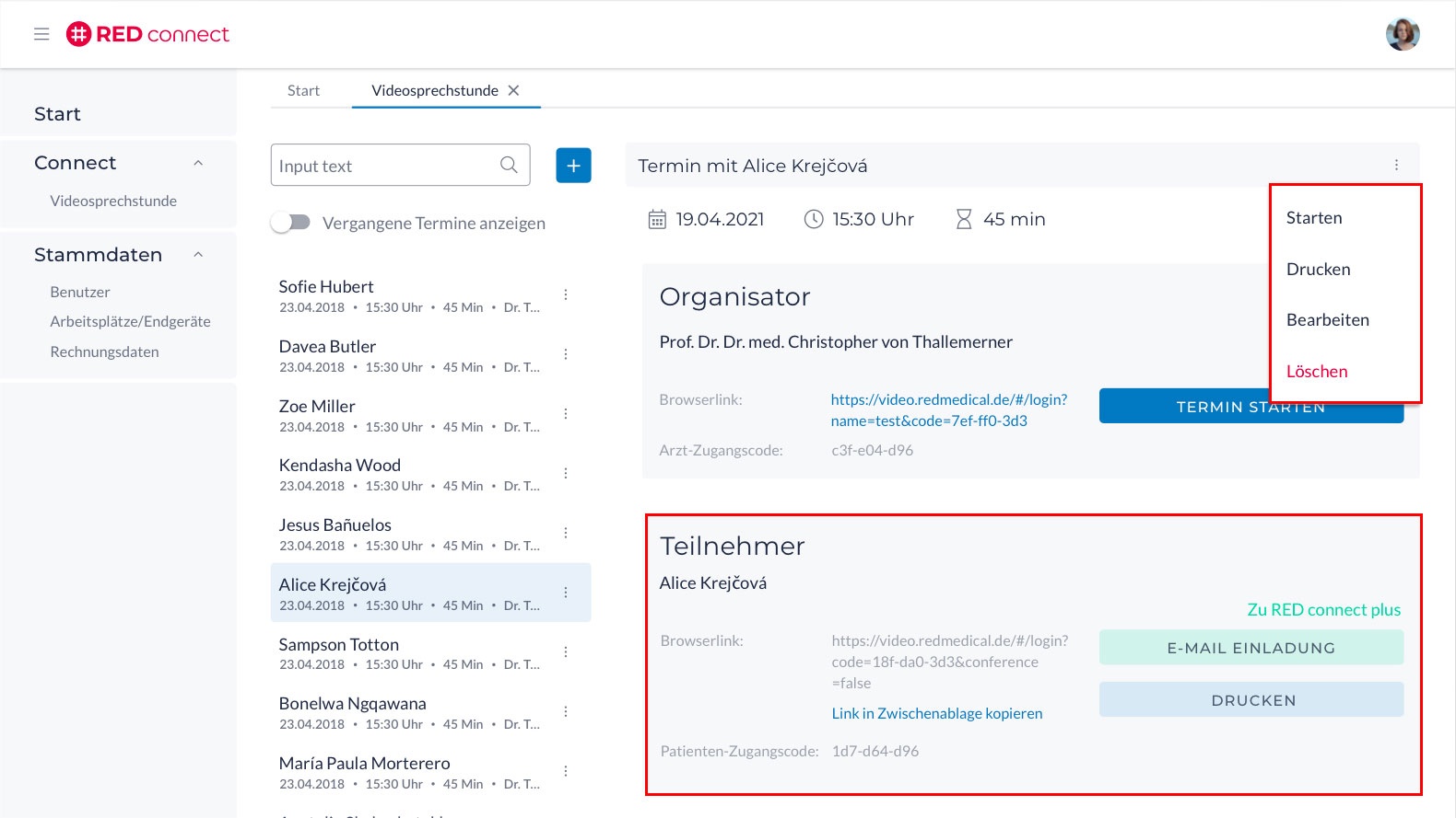 Organisatoren (bspw. Ärztinnen und Ärzte) richten die Termine ein. Als Teilnehmer (bspw. Patient oder Patientin)erhalten Sie Ihren Zugangscode von Ihrem Organisator.