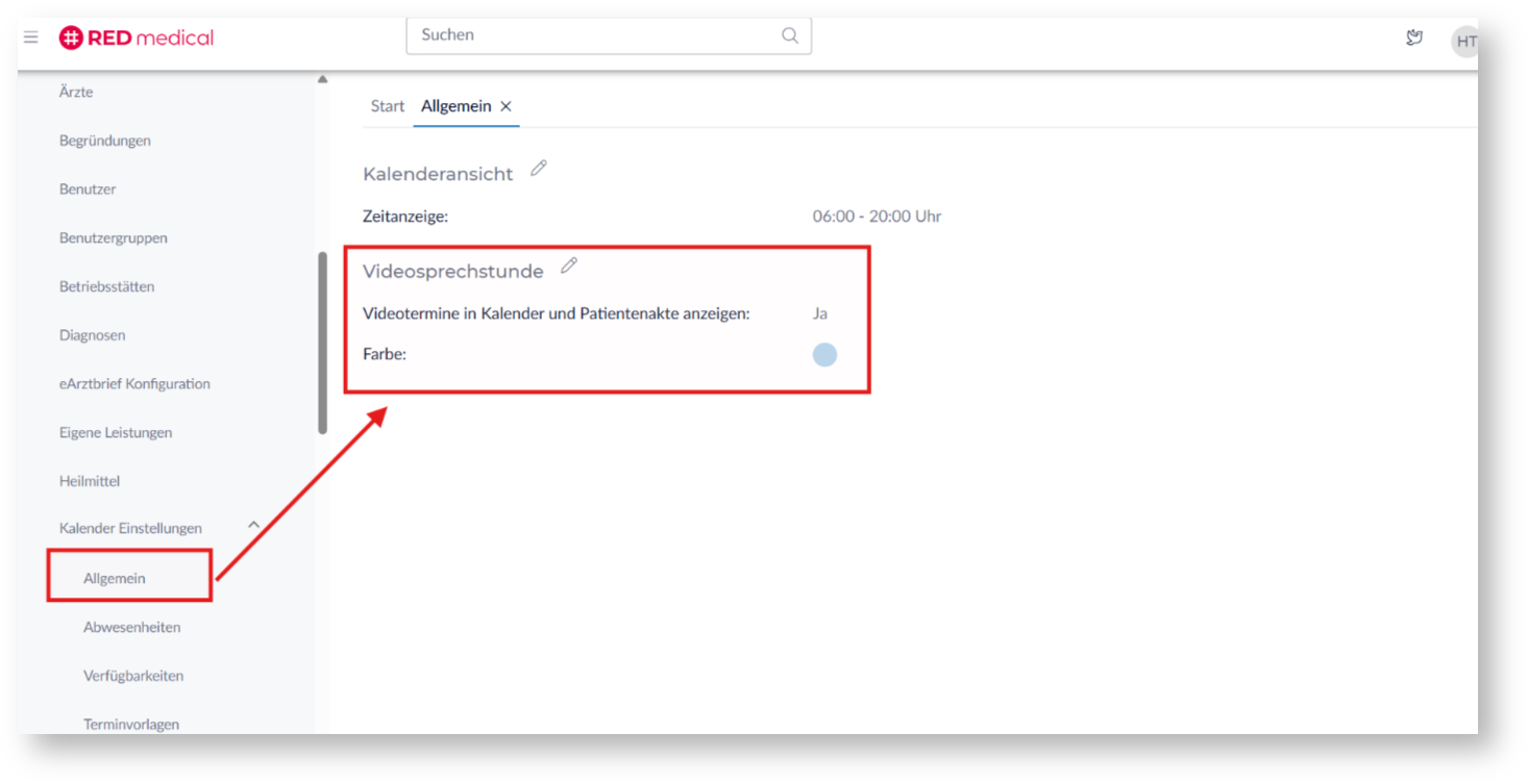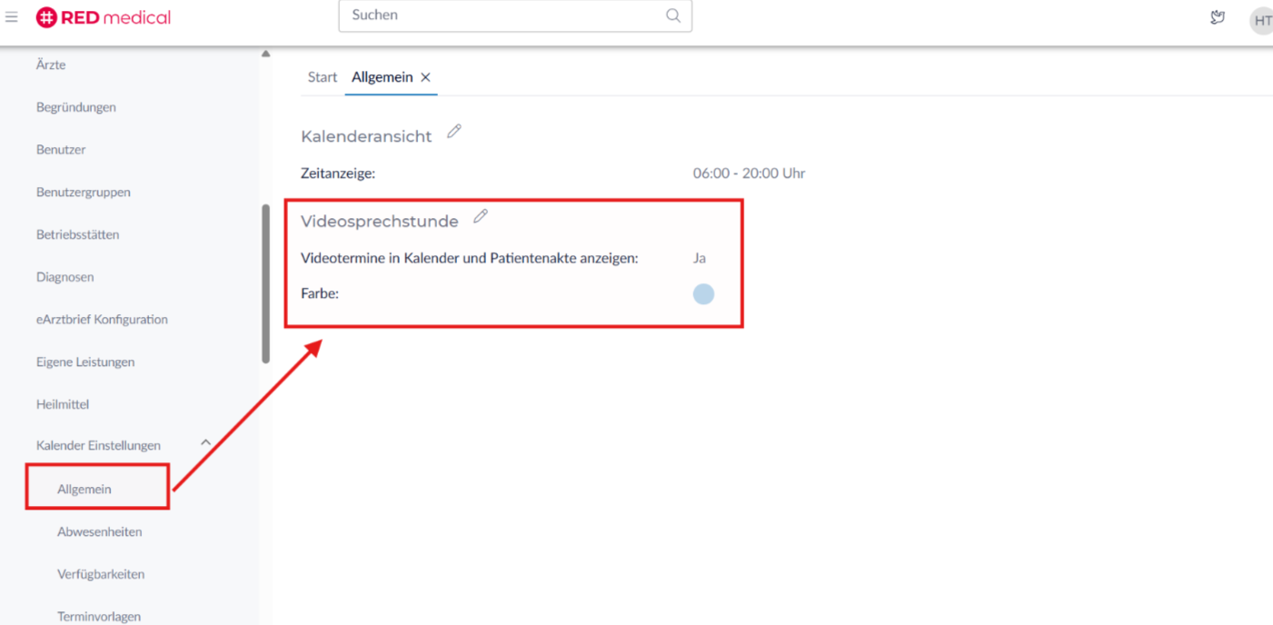 - Individuelle Konfiguration: Unter Stammdaten > Kalender Einstellungen > Allgemein (Bereich „Videosprechstunde“) kann die Speicherung deaktiviert oder eine spezifische Farbe zur besseren Unterscheidung festlegt werden.