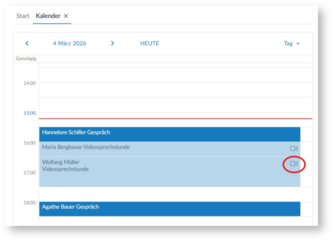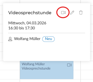 - Intuitive Bedienung: Videotermine sind im Kalender durch ein Kamera-Icon gekennzeichnet. Ein Klick auf den Termin öffnet eine Detail-Card, über die die Sprechstunde direkt gestartet werden kann (Kamera Symbol).