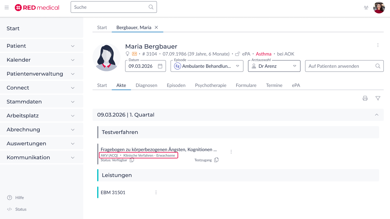 • Alle zu einem Patienten gespeicherten Daten, wie z.B. Leistungen, Diagnosen sowie  Formulare werden im Tab <Akte> angezeigt.