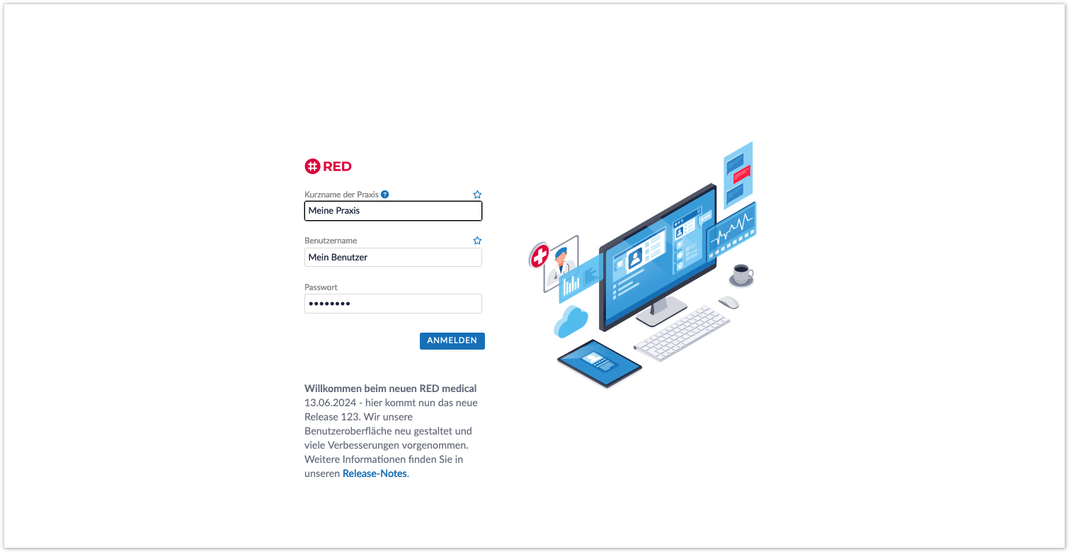 Wenn Sie RED medical classic aufrufen, werden Sie als erstes aufgefordert, sich im System anzumelden. Diese Anmeldung ist notwendig, da die Datenbank von RED medical classic persönliche und medizinische Daten Ihrer Patienten enthält, die besonders vor dem Zugriff Unbefugter geschützt werden müssen.