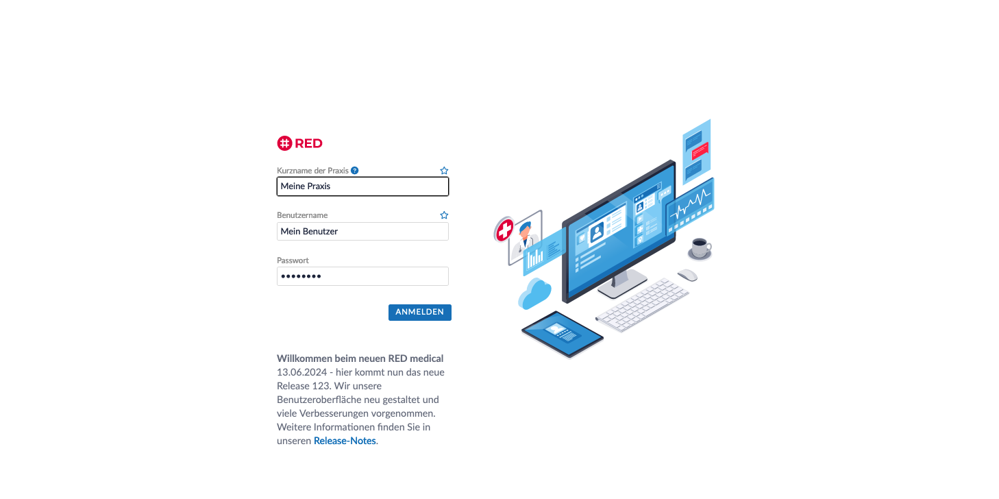 Wenn Sie RED medical classic aufrufen, werden Sie als erstes aufgefordert, sich im System anzumelden. Diese Anmeldung ist notwendig, da die Datenbank von RED medical classic persönliche und medizinische Daten Ihrer Patienten enthält, die besonders vor dem Zugriff Unbefugter geschützt werden müssen.