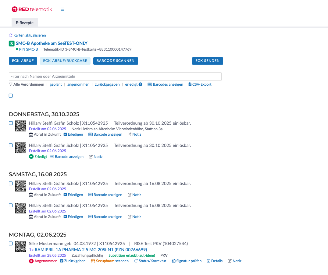 Wiederholungsrezepte sind ärztliche Verordnungen, die es ermöglichen, ein Medikament mehrfach in der Apotheke zu beziehen (sog. Teilverordnungen), ohne jedes Mal einen Arzt aufsuchen zu müssen. Diese Verordnungen haben ein Wirksamkeitsdatum und werden vollständig vom E-Rezept-Fachdienst erst dann zurückgegeben, wenn das Wirksamkeitsdatum erreicht ist. RED telematik safe ermöglicht es, zukünftige Teilverordnungenauch vor Erreichen ihres Wirksamkeitsdatums abzurufen und deren Abrufcodes für den späteren vollständigen Abruf zu sichern.