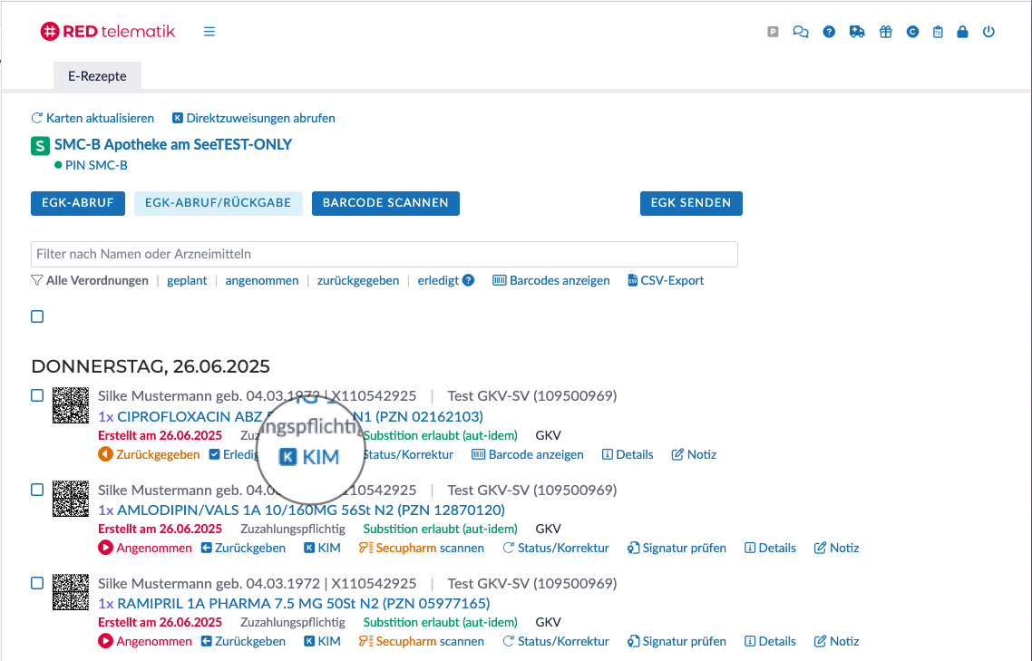 Neben der Möglichkeit, die Abrufdaten einer Verordnung mittels Barcode an ein weiteres System (z.B. Warenwirtschaft der Apotheke) weiterzugeben, besteht auch die Möglichkeit, die Abrufdaten empfangener Verordnungen mittels KIM an ein weiteres System weiter zu leiten, sofern dafür ein KIM-Konto eingerichtet wurde.