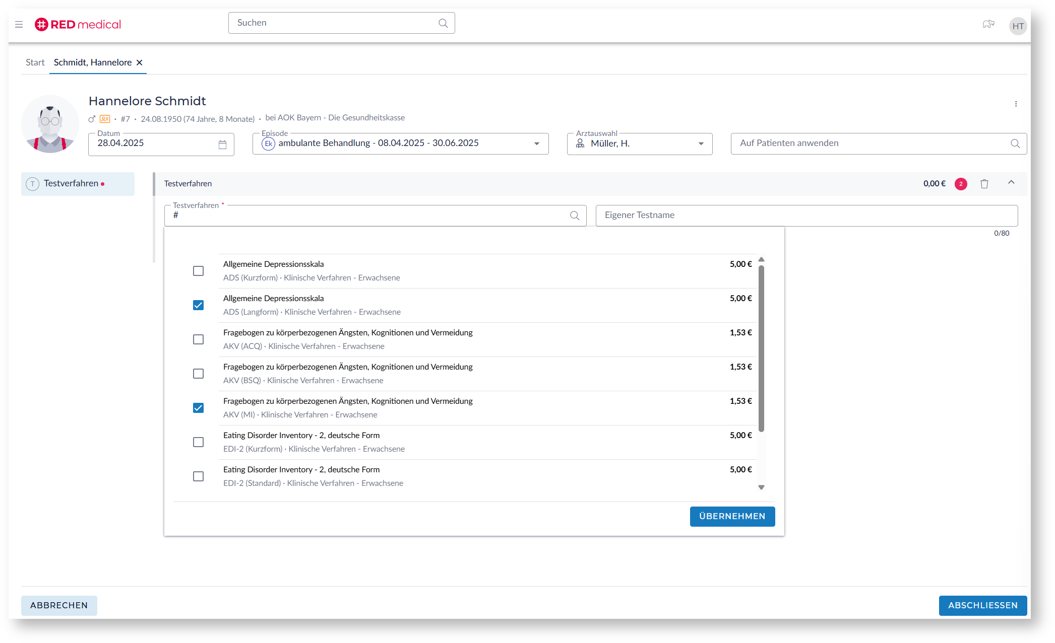 Über die Suche im Patienten gelangen Sie zu den in RED medical integrierten Hogrefe Testverfahren, welche Sie kostenpflichtig bestellen können.