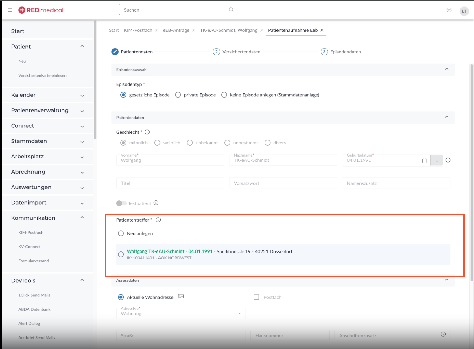 Sobald der Patient die Anfrage abgeschlossen hat, sendet dessen Krankenversicherung eine eEB an Ihre KIM-Adresse. Dementsprechend finden Sie alle diese Eingänge unter Kommunikation > KIM-Postfach > Ordner eEB.