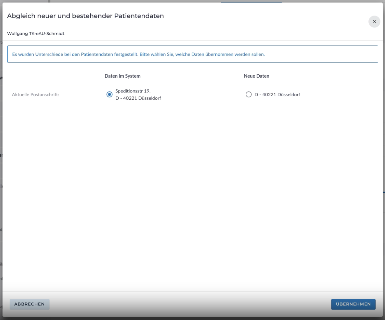 Gibt es Abweichungen zwischen den Patienteninformationen in Medical und im eEB, öffnet sich ein Dialog zum Informationsabgleich, der die vorhandenen Daten gegenüberstellt. Dabei haben die Angaben zu Versicherung und Versicherungsverhältnis aus dem eEB stets Vorrang.