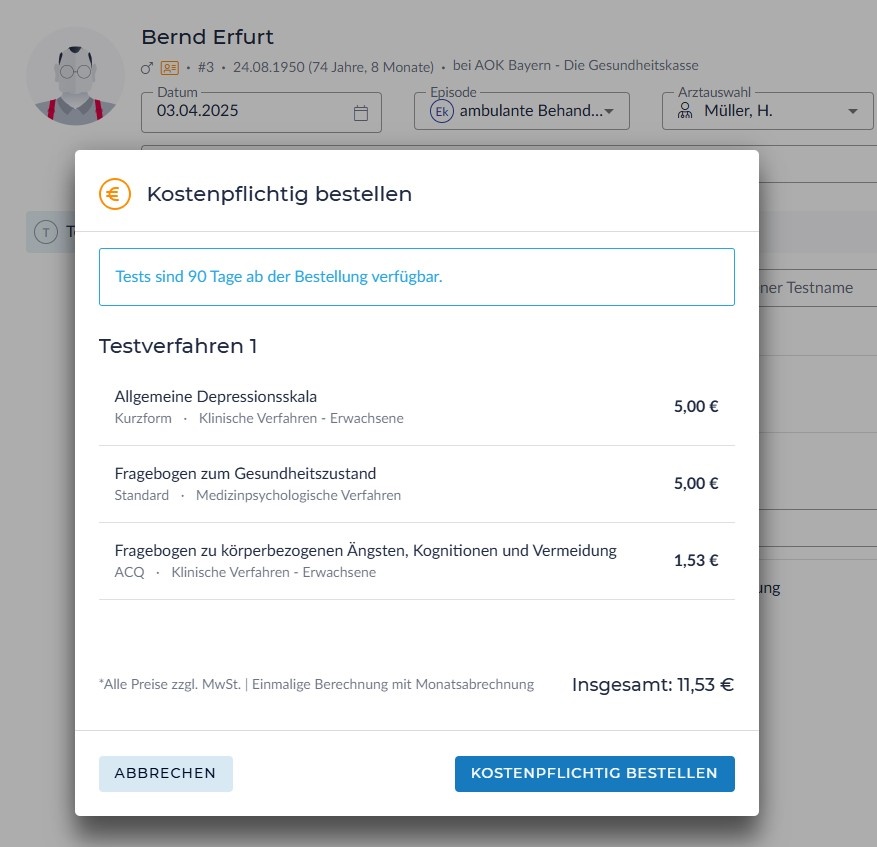 Nachdem Sie alle gewünschten Tests bei Ihrem Patienten hinterlegt haben klicken Sie auf <ABSCHLIESSEN>. Es erscheint eine Zusammenfassung der Tests sowie der Einzel- sowie Gesamtpreis.