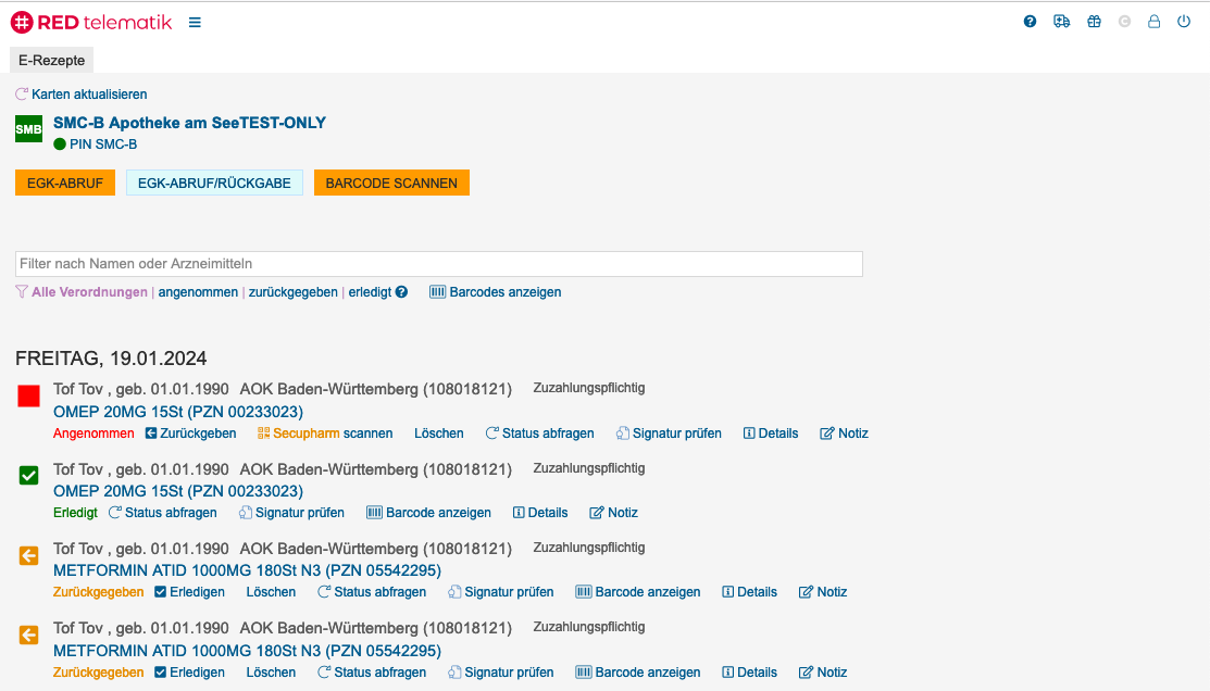 Der Benutzer hat das System aufgerufen und sich erfolgreich angemeldet. Elektronische Rezepte können nun über das Einscannen eines Barcodes von einem Patientendokument oder über die im Kartenterminal gesteckte eGK eines Patienten erfolgen.